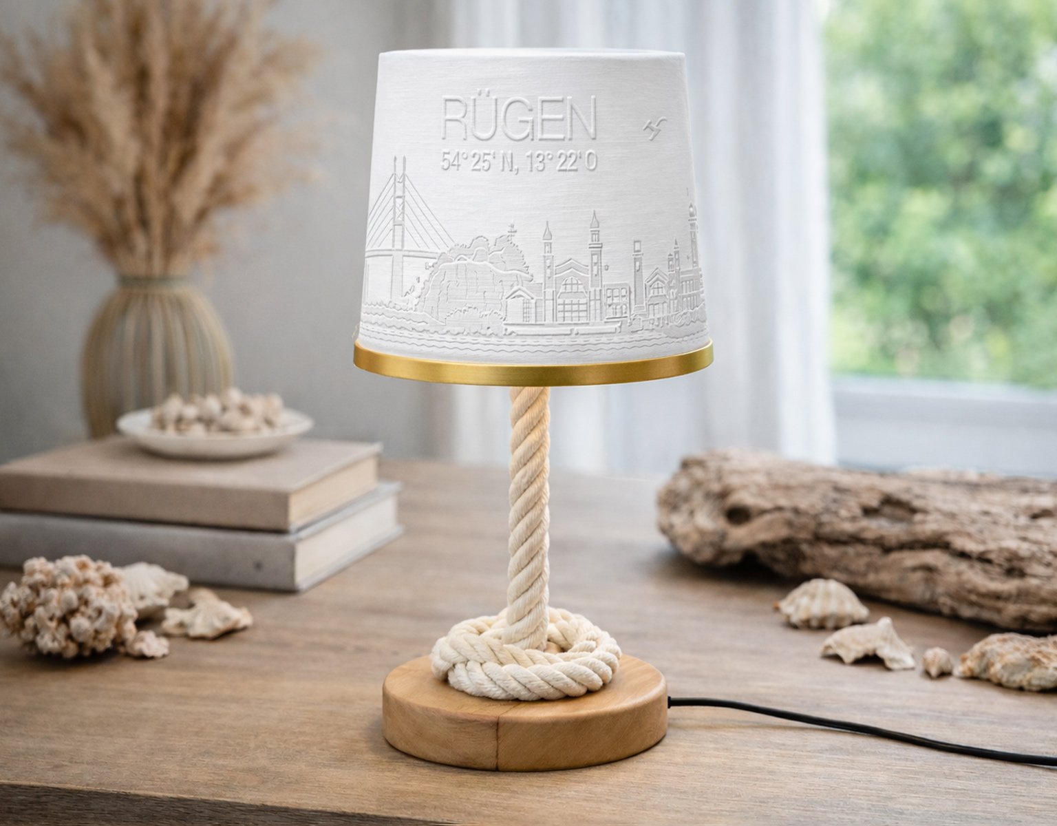 Diese stilvolle maritime Tischlampe verbindet modernes 3D-Druck Design mit und nordischer, maritimer Ästhetik. Der detailreiche Lampenschirm aus PLA-Lithophane zeigt ein fein ausgearbeitetes Rügen-Motiv, das im eingeschalteten Zustand dezent und elegant zur Geltung kommt. Das fein ausgearbeitete Motiv zeigt die wichtigsten Sehenswürdigkeiten der Insel Rügen als stilvolle Silhouette und macht die Lampe zu einem besonderen Blickfang für Liebhaber der Insel.