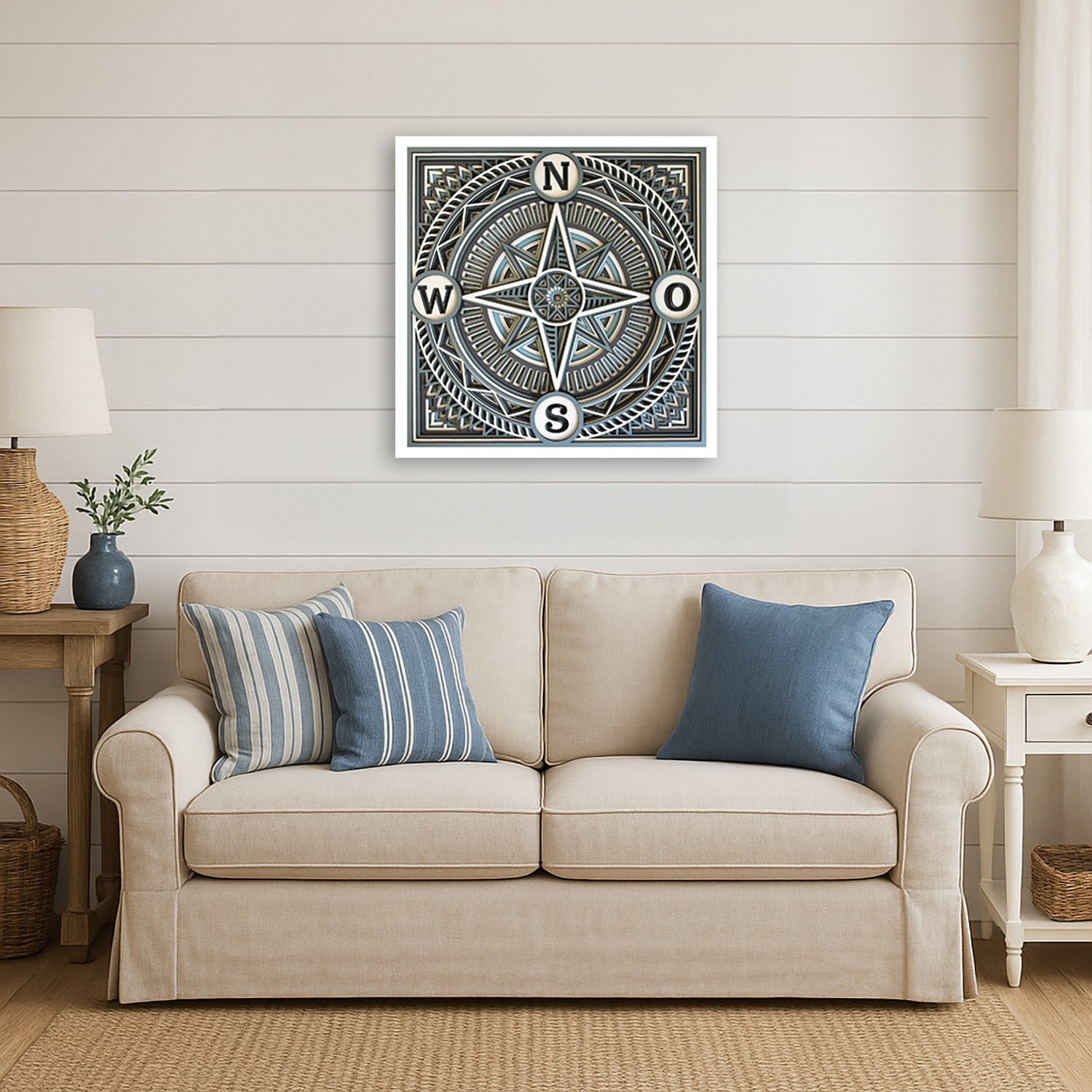 Bringe stilvolle Orientierung in dein Zuhause mit diesem einzigartigen Wandbild im Windrosen-Design. Inspiriert vom maritimen Flair und handwerklicher Präzision, ist dieses Kunstwerk ein echter Hingucker für alle, die den Landhausstil lieben.