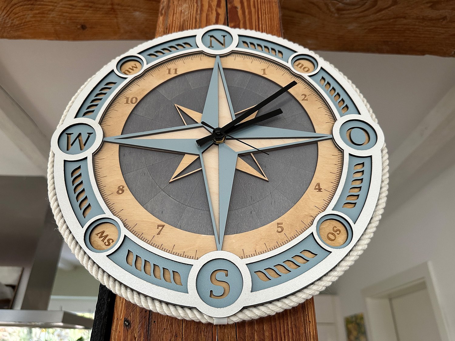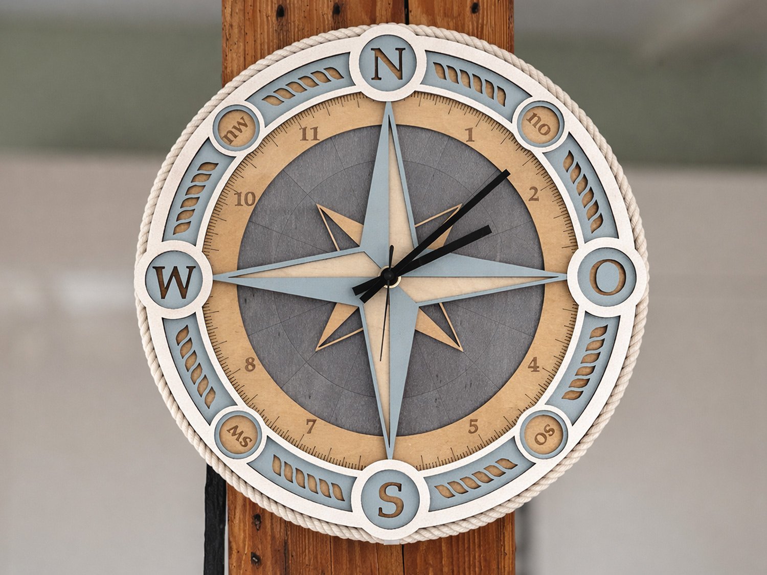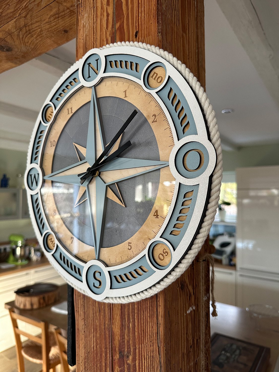 Maritime Wanduhr Windrose im Kompassdesign aus 4-lagigem, lasergeschnittenem Sperrholz mit Acrylglas.