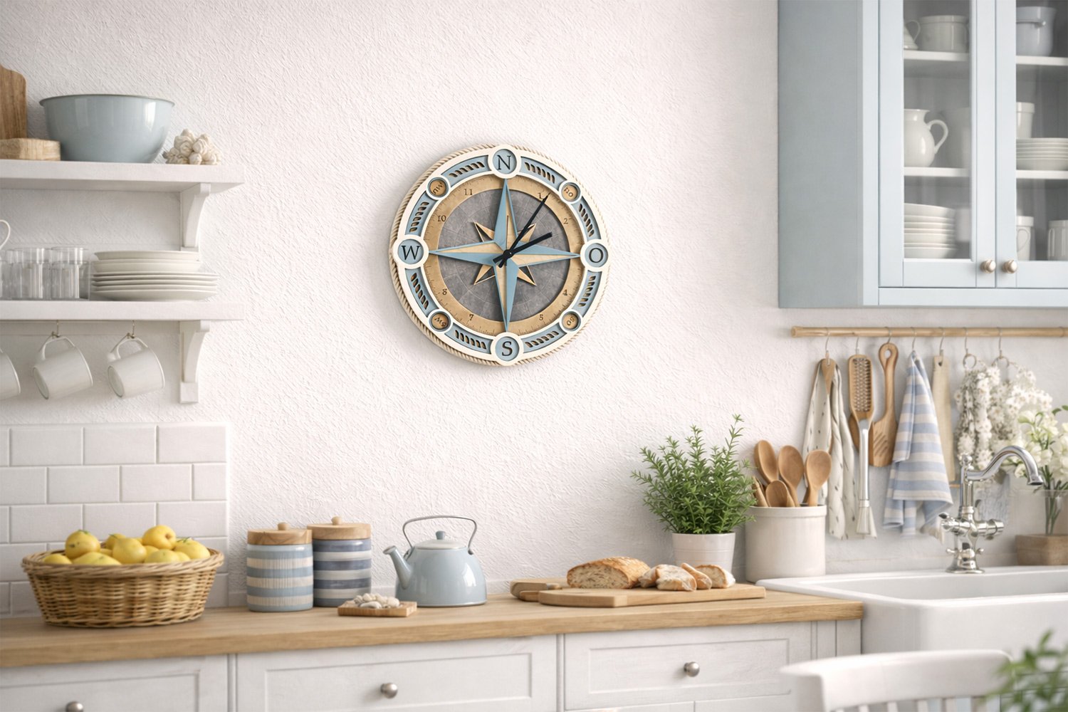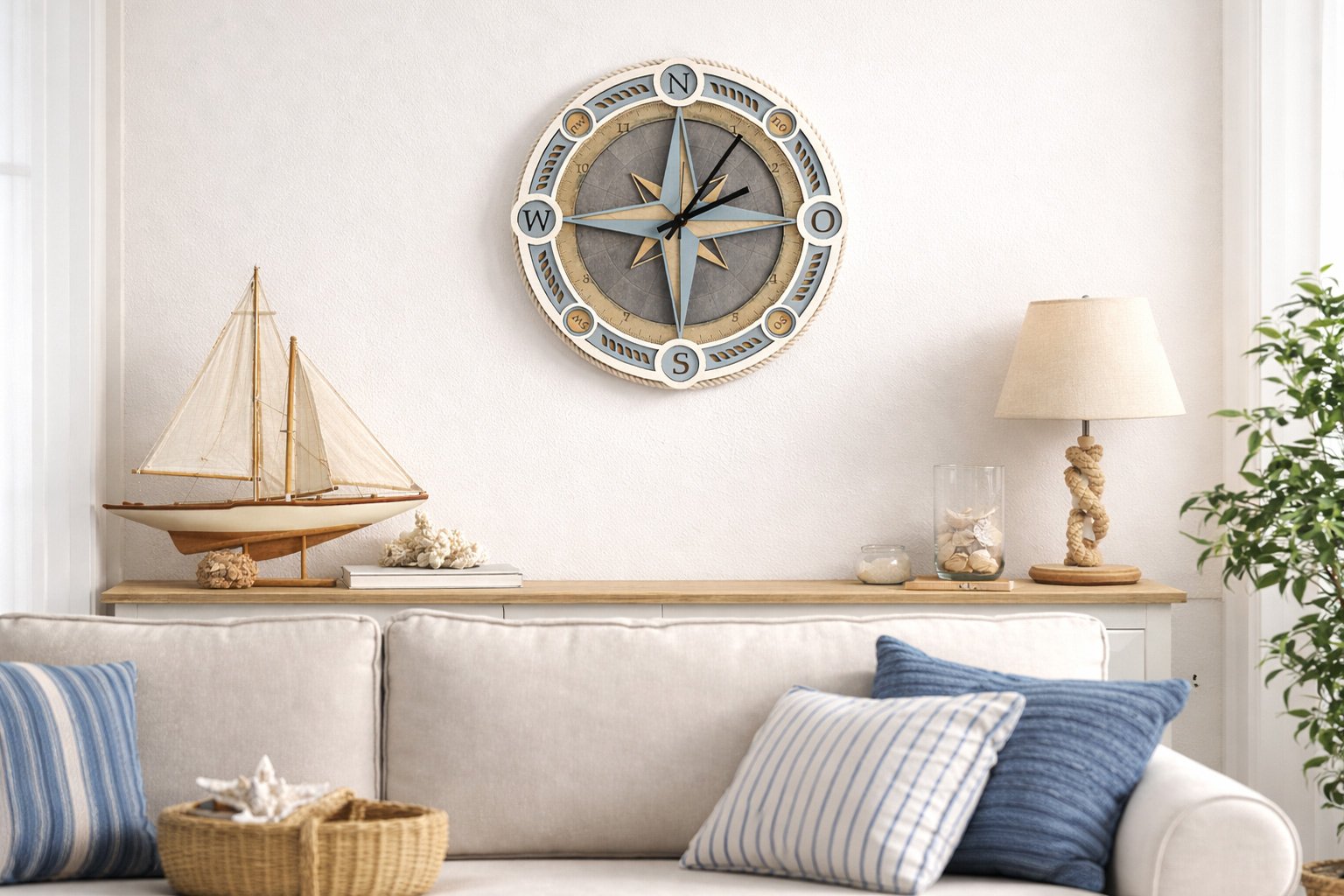 Diese exklusive Holzuhr vereint maritimes Design mit liebevoller Handarbeit und bringt maritimes Flair und Wärme in Dein Zuhause. Diese dekorative Wanduhr mit Kompassrose ist ein stilvoller Blickfang für Küche, Wohnzimmer oder Ferienhaus und passt perfekt zu Landhaus-, Coastal- und maritimen Wohnstilen.
